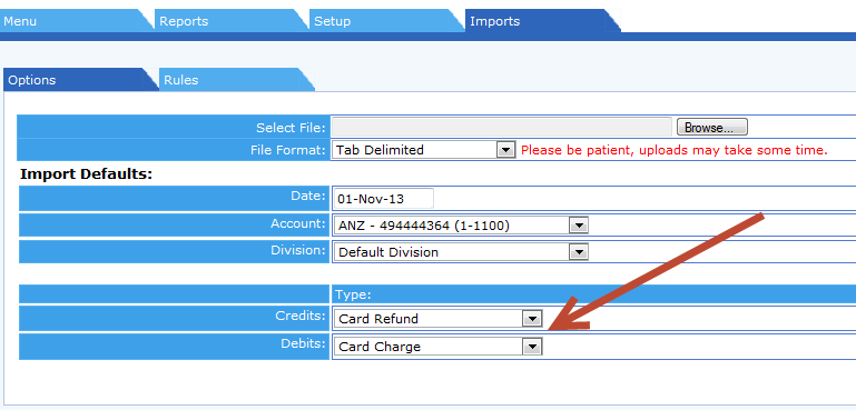 When importing credit card transactions, via Imports - > Banking, under types you need to select the following: